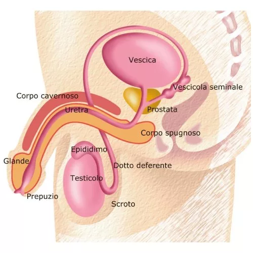 Sopra ciascun testicolo, posizionato come un elmo, c’è l’epididimo, della lunghezza di circa 5 cm. All’estremità più sottile dell’epididimo fuoriesce il dotto deferente che, passando nel canale inguinale, penetra all’interno dell’addome. I dotti deferenti, della lunghezza di circa 40 cm e del diametro di circa 2 mm, si dirigono verso l’alto fino a sboccare nella prostata. Prima di penetrare nella prostata, ricevono la secrezione di due piccoli organi, di 5-6 cm di lunghezza e 5 mm di spessore: le vescicole seminali.